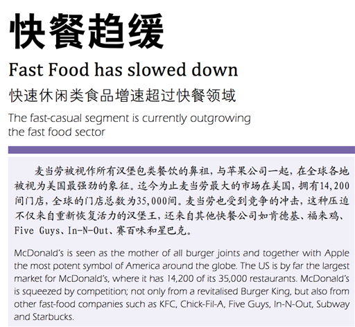 McDonald’s is seen as the mother of all burger joints and together with Apple the most potent symbol of America around the globe. The US is by far the largest market for McDonald’s, where it has 14,200 of its 35,000 restaurants. McDonald’s is squeezed by competition; not only from a revitalized Burger King, but also from other fast-food companies such as KFC, Chick-Fil-A, Five Guys, In-NOut, Subway and Starbucks. [...]
