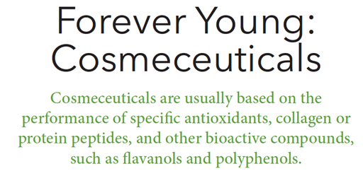 Cosmeceuticals are usually based on the performance of specific antioxidants, collagen or protein peptides, and other bioactive compounds, such as flavanols and polyphenols. [...]