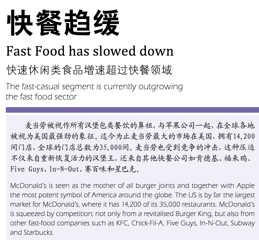 1 Apr Fast Food has slowed down (Chinese) Other Download this article 麦当劳被视作所有汉堡包类餐饮的鼻祖,与苹果公司一起,在全球各地 被视为美国最强劲的象征。迄今为止麦当劳最大的市场在美国,拥有14,200 间门店,全球的门店总数为35,000间。麦当劳也受到竞争的冲击,这种压迫 不仅来自重新恢复活力的汉堡王,还来自其他快餐公司如肯德基、福来鸡、 Five Guys、In-N-Out、赛百味和星巴克。 Share this article