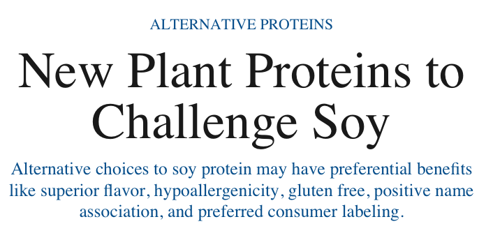 1 Nov New Plant Proteins to Challenge Soy Protein Download this article Alternative choices to soy protein may have preferential benefits like superior flavor, hypoallergenicity, gluten free, positive name association, and preferred consumer labeling. Share this article